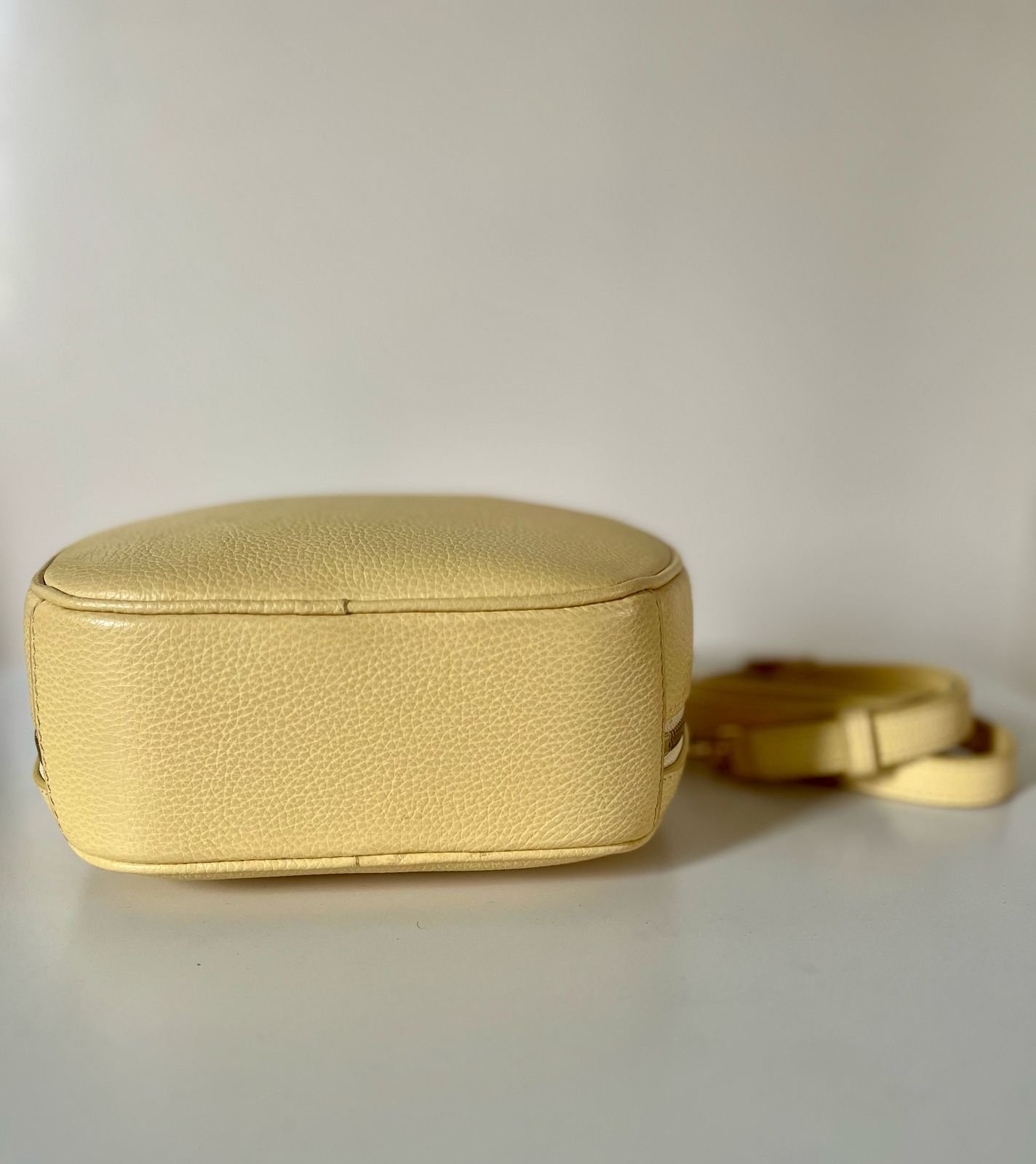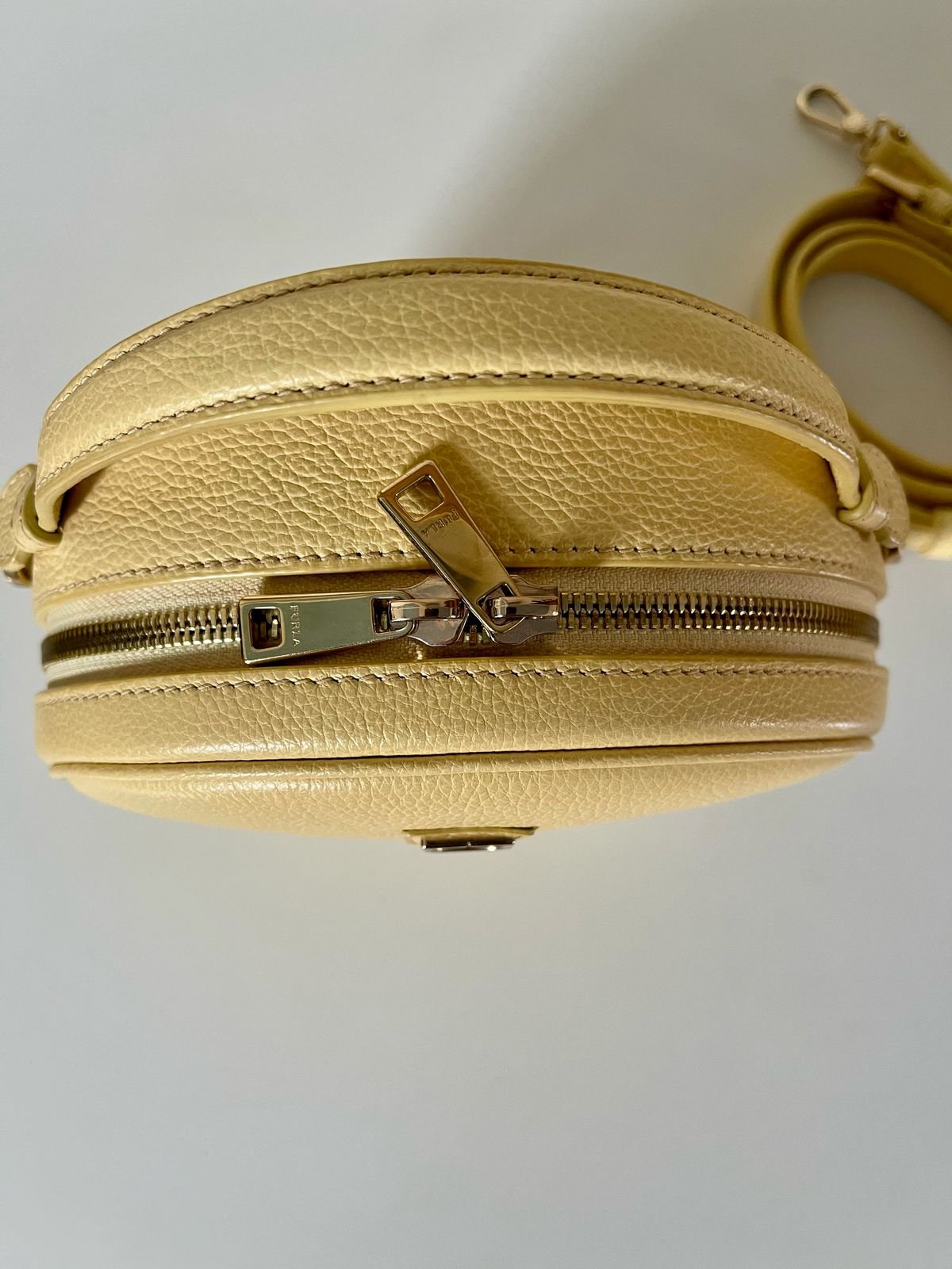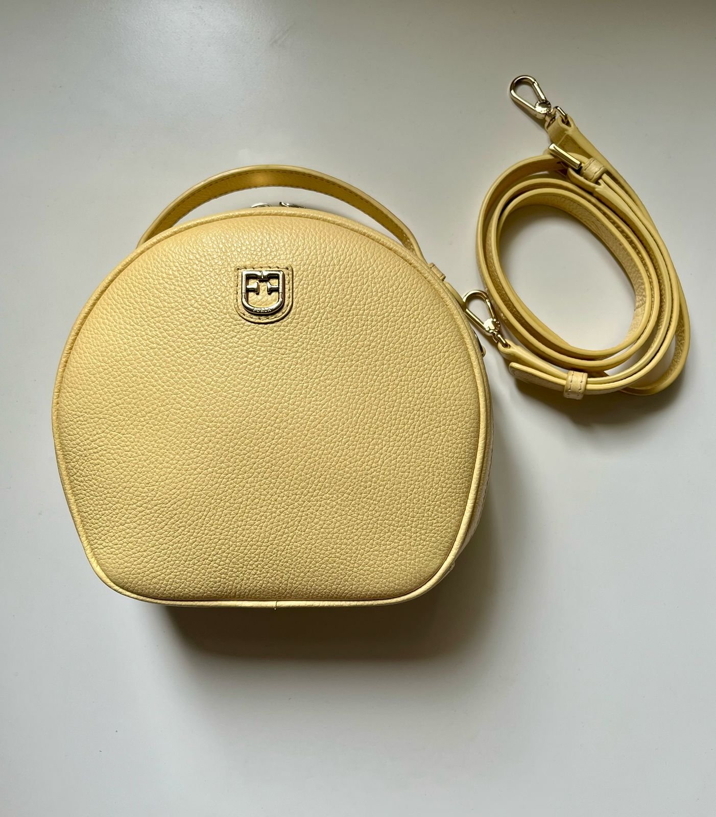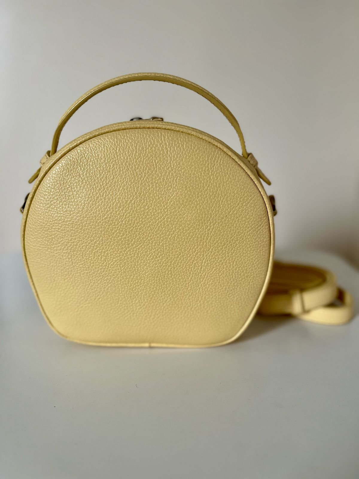 Essa é uma bolsa estruturada em formato redondo, super delicada e atual. Ela traz um ar retrô com toque moderno, perfeita para quem ama peças femininas e diferentes. Formato redondo, que chama atenção com elegância. Cor amarelo claro, ideal para iluminar looks neutros ou compor visuais criativos