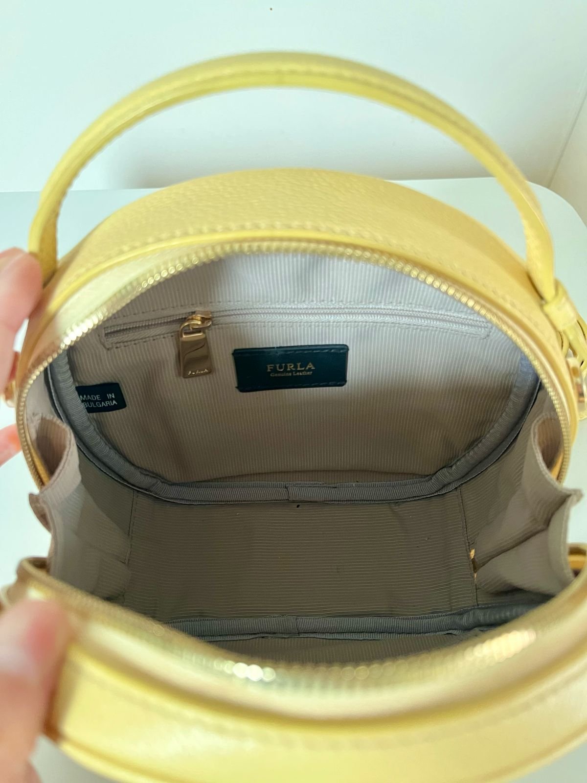 Bolsa furla em couro na cor amarela, usada poucas vezes, em excelente estado, pode ser usada como bolsa de mão ou a tiracolo, vem com uma alça em couro na mesma cor da bolsa, tds os detalhes da ferragem em dourado. Fechamento em ziper dourado personalizado. Interno em tecido com um compartimento e fechamento com ziper.