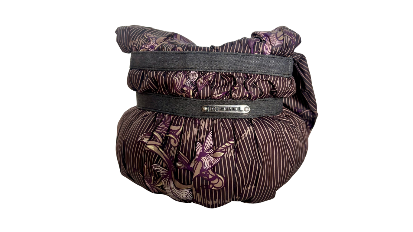 Bolsa Diesel Vintage em bom estado, em nylon estampado floral em tonalidade de marrom e vinho, detalhes em tecido jeans, ferragem com logo Diesel, fechamento com ziper, interno em nylon preto, interno com bolso e fechamento em ziper