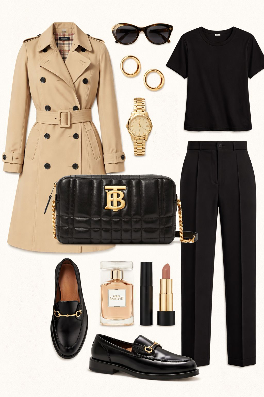 Na parte frontal, há um logotipo metálico dourado da marca Burberry, aplicado em relevo. O metal tem brilho polido, criando um contraste forte e elegante com o preto do couro — é o ponto focal da peça.