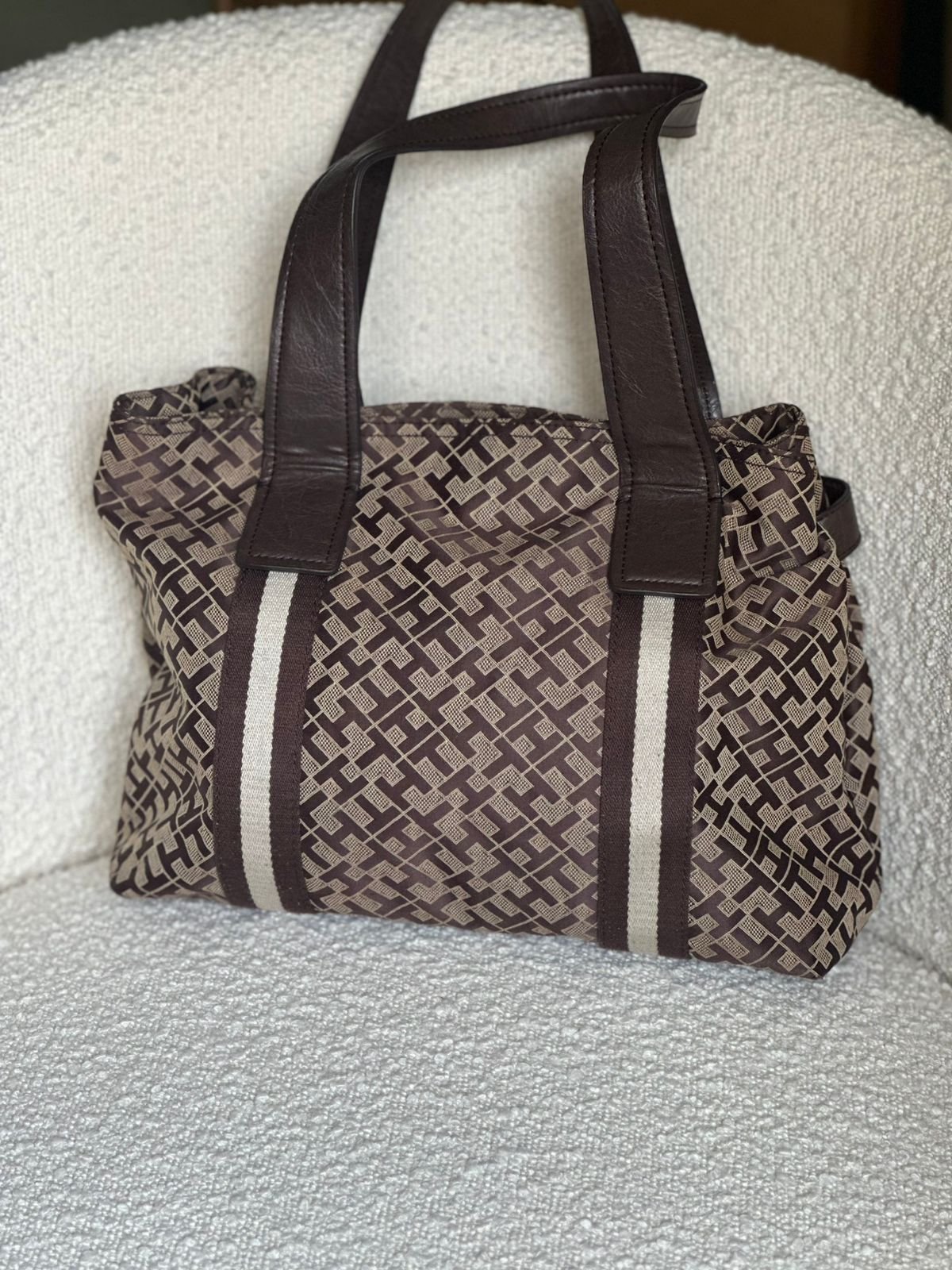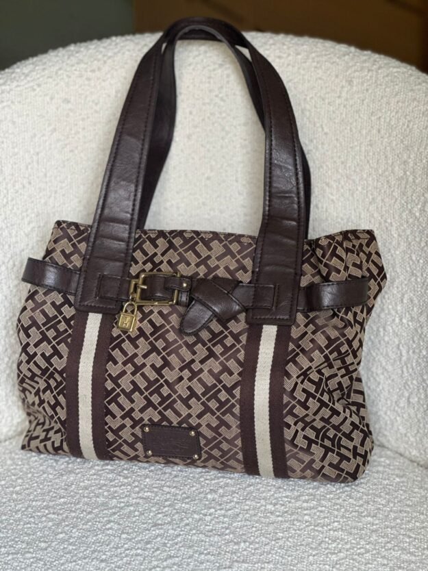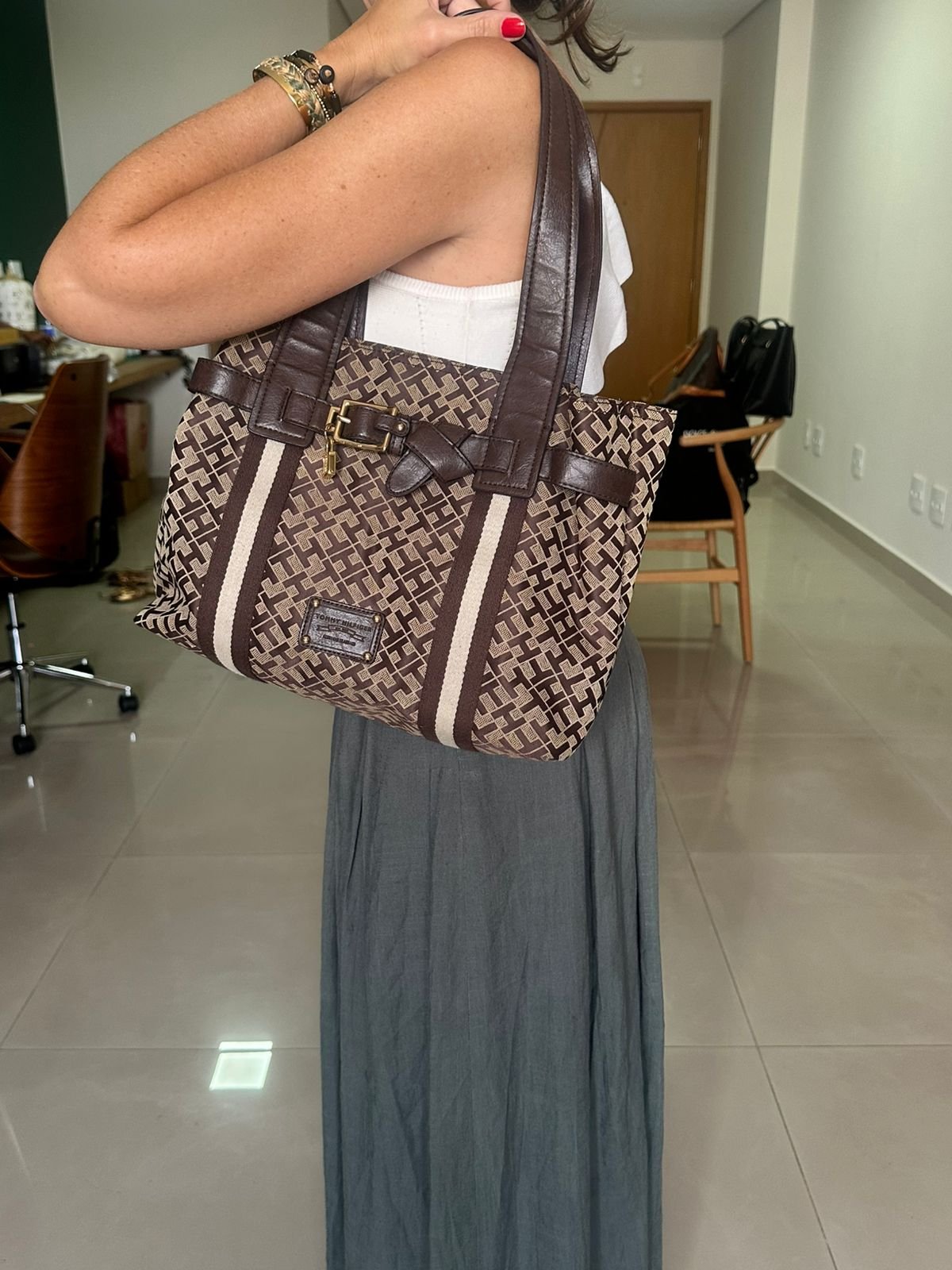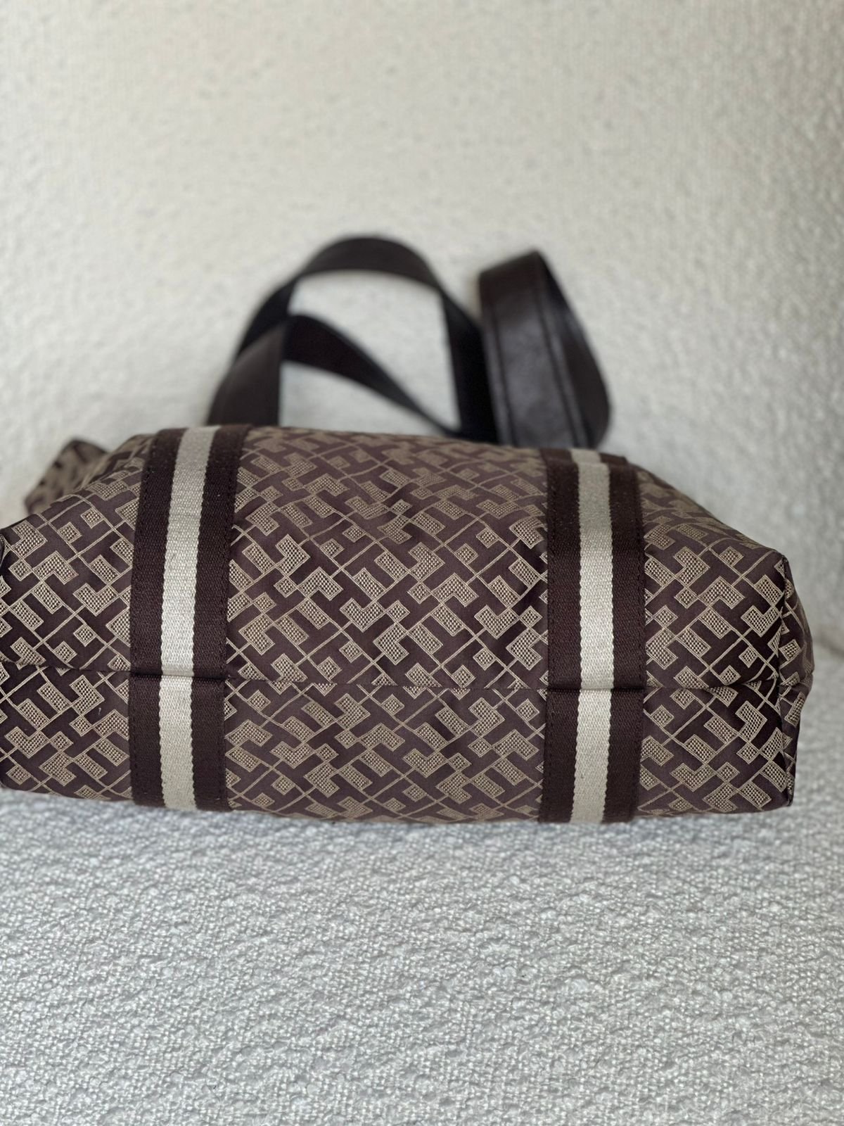Bolsa da marca Tommy Hilfiger a tiracolo em tons de marrom e bege, em bom estado, com design clássico e sofisticado. O corpo da bolsa é feito em tecido estampado com um padrão geométrico repetitivo, com o logo da marca, que dão movimento e estilo ao visual.