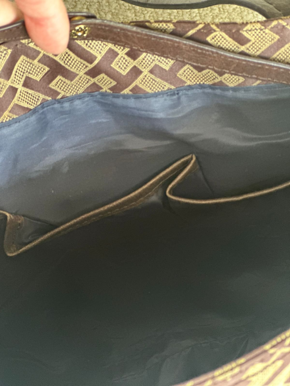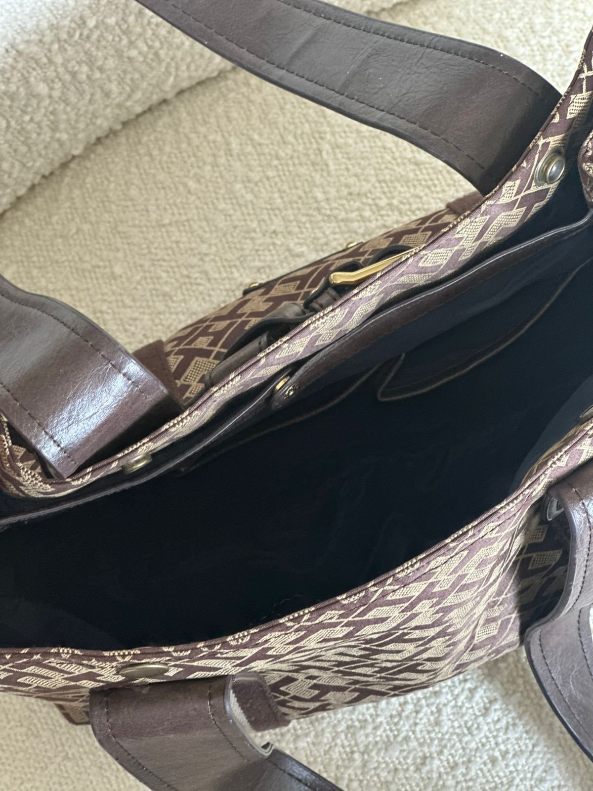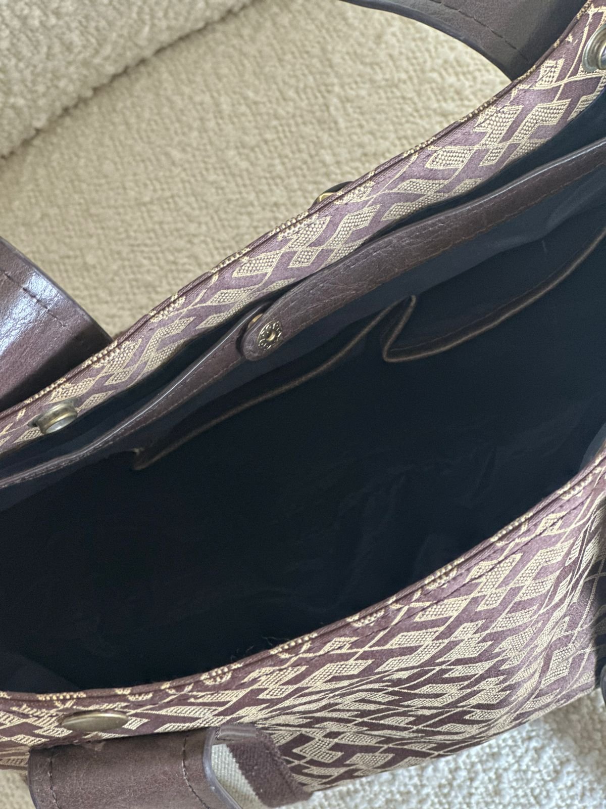 Bolsa da marca Tommy Hilfiger a tiracolo em tons de marrom e bege, em bom estado, com design clássico e sofisticado. O corpo da bolsa é feito em tecido estampado com um padrão geométrico repetitivo, com o logo da marca, que dão movimento e estilo ao visual.