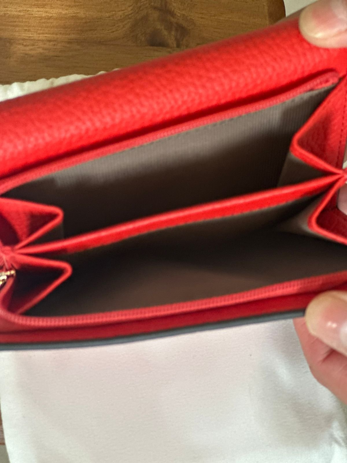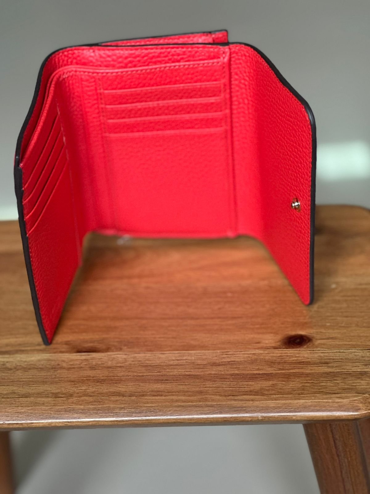 As bordas da carteira são marcadas com um acabamento em preto, criando um contraste delicado com o vermelho.
